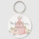 Este design apresenta um chaveiro de lembrancinha para presente de casamento. com uma dama de honra elegante e moderna, tipografia sofisticada e na moda, lembrancinhas para festas de noivado e chá de noiva, lembrancinhas para despedida de solteira e chá de noiva, vestido rosa informal casual e bonito, fonte caligráfica minimalista e simples, texto com letra cursiva simples em estilo vintage, flores botânicas em rosa e dourado, flores em aquarela e folhagens.