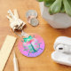 Uma joaninha em verde-menta, coberta de corações em cores rosa, roxo e verde. Ela tem um arco de queixo em volta do pescoço, e é colocada sobre um fundo brilhante de roxo, rosa e pêssego.