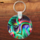 A vibrant, abstract composition features swirling patterns and bold colors, including greens, reds, and purples. The dynamic arrangement creates a sense of motion and energy.