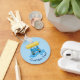 Um carro azul sorridente lavando-se com pincel de lavagem de roupa. Cor de fundo personalizada. Texto personalizado de ambos os lados.
