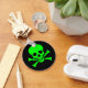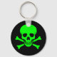 Chaveiro preto com um crânio amarelo-esverdeado brilhante e ossos cruzados.