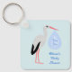 Esta diversão para salvar a data chá de fraldas do chaveiro de apresenta uma imagem gráfica de uma bela Stork branca com penas pretas na cauda segurando um pacote azul claro de cobertores. Há um texto azul no pacote que diz "Menino". Esta design é perfeita para celebrar um menino. O texto é personalizável para que você possa incluir o nome da futura mãe na frente e a data do chá de fraldas no verso.