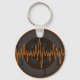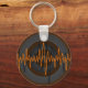 Design moderno e estilizado inspirado em auto-falantes e ondas sonoras. As ondas sonoras cor de laranja claras movem-se através de círculos concêntricos em cinzas, preto e laranja. Chaveiro com um design personalizável para você personalizar com seu próprio texto, imagens e ideias. Arte original criada usando técnicas digitais por Jess Perry.