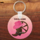 Uma ilustração gráfica de uma roda de vagão ocidental, chapéu de vaquinha e botas de vaquinha num chaveiro de preço especial. O chaveiro tem um modelo de texto para sua personalização. Arte original: Direitos autorais Charmaine Paulson