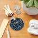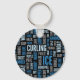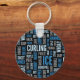 Chaveiro com um padrão de termos de enrolação em tons de azul e cinza sobre fundo preto. Perfeito para curtidores e ventiladores.