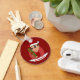Chaveiro com uma ilustração de um lindo menino feliz sorridente, ele está vestindo fantasia vermelha e branca do Papai Noel e segurando um presente; com um modelo de texto editável para seu nome ou mensagem, design de Natal com fundo vermelho