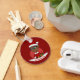 Chaveiro com uma ilustração de um menino feliz sorridente com óculos, ele está vestindo fantasia de Papai Noel vermelho e branco e segurando um presente; com um modelo de texto editável para seu nome ou mensagem, design de Natal com fundo vermelho