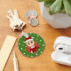 Design com uma ilustração de uma menina feliz sorridente com cabelo loiro curto, ela está vestindo a fantasia vermelha e branca do Papai Noel e segurando um presente; design de Natal com um fundo verde sem soldadura com estrelas