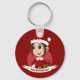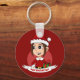 Chaveiro com uma ilustração de uma menina feliz sorridente com cabelo comprido e castanho, ela está vestindo fantasia de Papai Noel vermelho e branco e segurando um presente; com texto editável modelo para seu nome ou mensagem, design de Natal com fundo vermelho