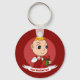 Chaveiro com uma ilustração de uma menina ou um menino feliz sorridente, o bebê está vestindo roupas vermelhas e brancas e segurando um presente; com um modelo de texto editável para seu nome ou mensagem, design de Natal com fundo vermelho