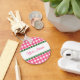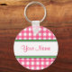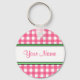 Um chaveiro com um fundo de gingham rosa com forma verde. Personalize com seu nome na seção central.