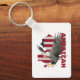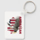 Essa chaveiro apresenta uma design gráfica impressionante de uma águia em voo médio com suas asas espalhadas por toda parte, sobreposta à silhueta de um contorno de mapa dos Estados Unidos. O fundo inclui um padrão de bandeira americana com listras vermelhas e brancas e um campo azul com estrelas. A palavra "AMERICAN" aparece em letras maiúsculas e design. Esta design simboliza o orgulho e a identidade americanos, fazer-a como um acessório perfeito para aqueles que querem mostrar o seu patriotismo.