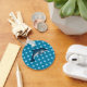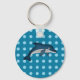 Esta chaveiro apresenta uma ilustração de um golfinho. O golfinho está sobre um fundo azul com bolinhas azuis mais claras.