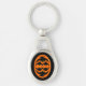Este chaveiro espetacular apresenta um oval laranja com seis corvos. Cada corvo tem olhos amarelos com pupilas pretas e asas salientes. Os corvos voam em direção uns aos outros formando uma forma oval. O fundo é preto.