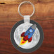 Um foguetão vermelho, azul e cinza, motores disparando, cruza sobre a lua no espaço escuro.