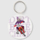 Um desenho animado japonês de uma mulher vestida com engrenagens roxas e capacete está montando uma bicicleta de sujeira de motocross vermelha. Atrás dela está escrita levemente, Pintinho de Dirt Bike. Diversão de chaveiro de moto para senhoras que andam fora da estrada.