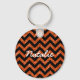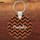 Hip e Trendy Chevron Glitter Look Chaveiro. Este legal chaveiro apresenta um padrão de zag de zague em forma de guiões em cima de um fundo de brilho laranja da arte digital. Adicione texto a este design para lhe dar um toque pessoal.