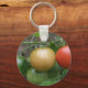 Esta bela chaveiro mostra uma fotografia de um monte de tomate amadurecendo incluindo um tomate vermelho, laranja e verde de cereja em uma linha, crescendo em uma planta de tomate em um jardim suburbano. A fotografia foi tirada usando macro fotografia para um resultado detalhado.