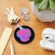 Esta bonito chaveiro apresenta uma bela fotografia de uma tulipa. A fotografia foi colorida artificialmente, resultando numa tulipa fluorescente. As pétalas exteriores são coloridas com tons azuis e vermelhos, enquanto as pétalas interiores apresentam tons de rosa e roxo. O centro da flor é amarelo claro. O simples fundo preto mostra a beleza impressionante desta flor.