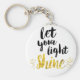 Estilo de caligrafia de Pincel moderno com palavras, "Deixe sua luz brilhar" (baseado em Matthew 5:16), em efeito de estilo ouro. A palavra "brilho" tem ilustrações de raios-luz que se estendem de ambos os lados.
