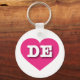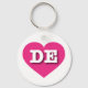 Esta cadeia de teclas apresenta um coração rosa-quente vibrante contendo as letras maiúsculas, brancas e em negrito DE, a abreviatura oficial de Delaware, o primeiro estado.