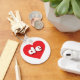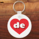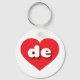 Esta cadeia-chave apresenta um coração vermelho vibrante contendo as letras maiúsculas de letras maiúsculas, brancas e arredondadas, uma abreviação lúdica para o estado de Delaware, o primeiro estado.