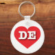 Esta cadeia de teclas apresenta um coração vermelho vibrante contendo as letras maiúsculas, brancas e em negrito DE, a abreviatura oficial de Delaware, o primeiro estado.