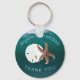 Chaveiro de casamento tropical favorece com estrelas e dólar. Fundo de água do oceano azul profundo com texto curvo em anéis-chave redondos.