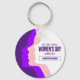 Celebrar o Dia Internacional da Mulher no dia 8 de março com este chaveiro colorido, que apresenta silhuetas roxas, cor de pêssego e brancas de rostos femininos com o tema de 2024 e a hashtag Inspire Inclusion em elegantes caracteres de bloco. O reverso mostra design idêntico. Design © W.H. Sim. Mais informações em zazzle.com/expressionsoccasions