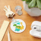 Um fofo design de desenho animado para crianças, personalizado, com dinossauros pré-históricos do período Jurássico em cores brilhantes de amarelo azul e verde. Apresentando um T-Rex, um tiranossauro Rex, um Tricerátopo e um Brontossauro. Um design bonitinho para um menino ou menina. Adicione o nome da criança para tornar este chaveiro neutro em termos de gênero um presente especial extra.