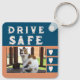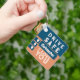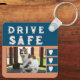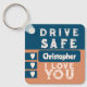 Corrente de dois lados, ideia do anel chave. Adicione um nome à frente e uma foto atrás. Dirija em segurança. Eu te amo. Azul e coral com corações amorosos.