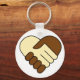 Um homem negro e um homem branco tremendo as mãos. Símbolo ou logotipo em forma de coração na chaveiro