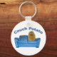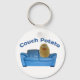 Chaveiro de botão de uma personagem engraçada de batata num sofá azul com a formulação Couch Potato. O presente perfeito para aquela pessoa que gosta de passar muito tempo relaxando.