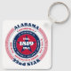 O Chaveiro do estado do Alabama tem um design de tipografia circular com cores vermelho, branco e azul em um fundo branco. O texto inclui o nome, capital, abreviação de estado, nome do residente, região, fuso horário, coordenadas geográficas, ano de sua soberania e país - Estados Unidos da América. Ideia patriótica única de presente.
