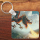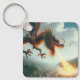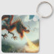 Um dragão de estilo chinês mergulhando do céu respirando fogo em uma pequena vila. Por martinspixs.
