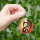 Este dragão tribal preto fica sobre um fundo vermelho e amarelo brilhantes. O sol aparece logo atrás da cabeça do dragão que está virado para baixo numa pose elegante. O corpo da serpente cobra-se e depois curva-se de volta para baixo com as grandes asas pretas que se estendem para fora. Este padrão espantoso faz uma bela chaveiro.