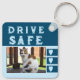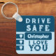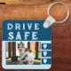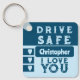 Corrente de dois lados, ideia do anel chave. Adicione um nome à frente e uma foto atrás. Dirija em segurança. Eu te amo. Azul escuro e pálido com corações amorosos.