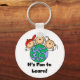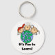 Três garotos bonitos cercam um globo mundial e o texto diz: "É divertido aprender!" nas camisetas da escola, cartões, canecas, adesivos, botões e outras engrenagens!