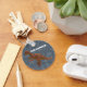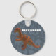 Crie um presente personalizado perfeito para fãs de dinossauros jovens e velhos. Esta chaveiro apresenta uma foto de um dinossauro de brinquedo plástico edmontosaurus, em cor laranja feroz, com pontos azuis colocados contra uma cinza azul apresentando um padrão de fósseis de pegadas de dinossauro. Adicione o seu próprio nome ou outro texto em letras brancas a negrito.