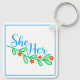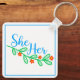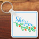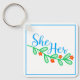 Ela está em Flores num chaveiro para ti. Uma maneira bonito de mostrar seus pronomes com folhas verdes e flores laranja avermelhadas.