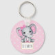 Um chaveiro com uma ilustração de aquarela de elefante rosa e fofinha. Ela tem orelhas bonitinhas, cor-de-rosa e bolinhas branca e arco bonito de fita rosa sobre a cabeça. O plano de fundo é rosa claro com bolinhas coloridas creme.