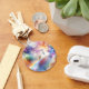 Ilustração de aquarela. Encontro vocês na Ponte do Arco-íris. Uma cena reluzente, sonhadora, representando uma ponte colorida e etérea do arco-íris esticando uma paisagem fantástica cheia de nuvens suaves e girantes em tons vibrantes de azul, rosa e amarelo. A atmosfera é serena e mágica, evocando um senso de maravilha e tranquilidade, cercada por estrelas e trilhas de luz que realçam o sentimento encantador da cena.
