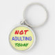 Este chaveiro amarelo redondo tem a legenda "NÃO ADULTANDO HOJE" em cores vermelho, azul e verde claras. Há também uma face rabiscada no 'O' de NOT.