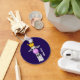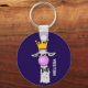 Um chaveiro com uma lama branca a soprar uma grande bolha rosa. Vestindo uma coroa dourada e uma gravata arco preta. Fundo roxo escuro.
