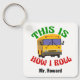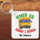 Este presente engraçado de chaveiro para um motorista de ônibus escolar mostra um ônibus escolar amarelo perto da frase hilariante Isto é Como eu Rolo. Uma legal referência de pop para um motorista de ônibus que gosta de humor moderno. Monograma desta cadeia-chave para um presente agradável e personalizado.