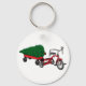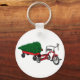 Entrega da árvore de Natal em um pequeno vagão vermelho, estilo triciclo. Um presente retrô muito bonito.