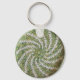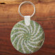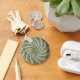 Imagem fotográfica de uma almofada redonda de crochet com verdes variegados como fundo e branco como os braços espirais radiando do centro.