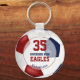 Este chaveiro de futebol feminino com cores vermelhas e azuis apresenta uma bola de futebol clássica com painéis vermelhos, azuis e brancos - personalize o nome do jogador e o número de camisa mais a escola e o nome do mascote da equipe - por katz_d_zynes