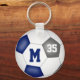 Este chaveiro de futebol feminino com cores azuis e cinzas apresenta a palavra "gol" com a silhueta sobre a qual uma jogadora de futebol feminino chutou uma pequena bola de futebol preto e branco mais o nome personalizável do jogador e o número de camisa e o nome da escola e mascote, tudo sobre um azul estilizado, cinza e gráfico de bola de futebol branco - por katz_d_zynes