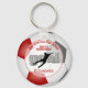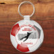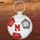 Este chaveiro de futebol feminino com cores vermelhas e cinzas apresenta a palavra "gol" com a silhueta sobre a qual uma jogadora de futebol fêmea chutou uma pequena bola de futebol preto e branco mais o nome personalizável do jogador e o número de camisa e o nome da escola e mascote, tudo sobre um gráfico vermelho estilizado, cinza e bola branca de futebol - por katz_d_zynes